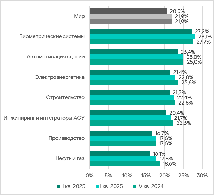 Во втором квартале 2025 года рейтинг исследуемых отраслей и типов ОT-инфраструктур по доле компьютеров АСУ, на которых были заблокированы вредоносные объекты, традиционно возглавили биометрические системы.