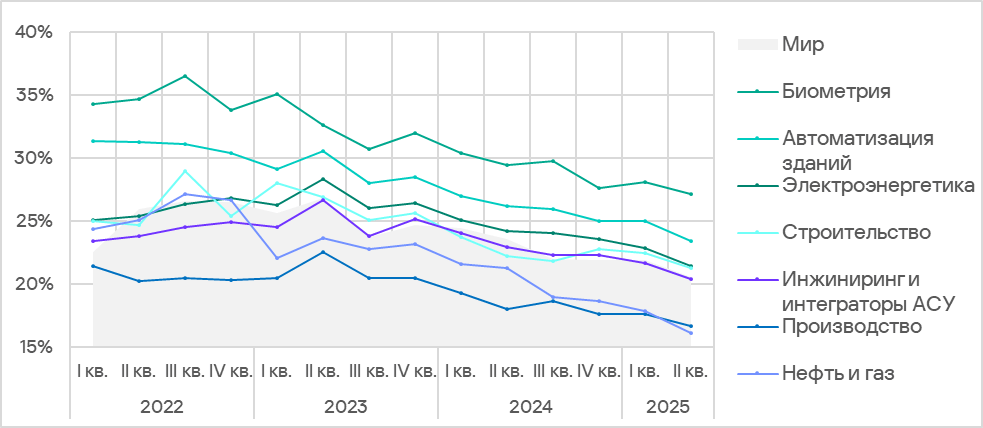 Во всех исследуемых отраслях доля компьютеров АСУ, на которых были заблокированы вредоносные объекты, во втором квартале 2025 года уменьшилась.