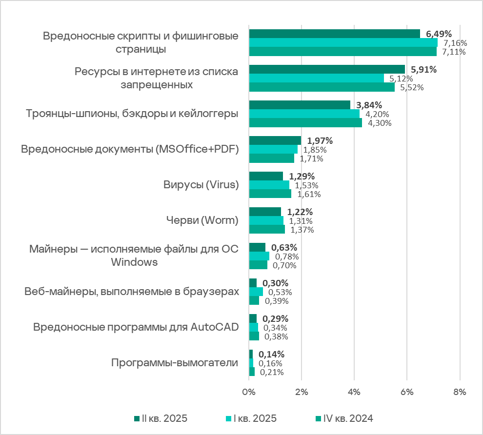 Во втором квартале 2025 года доля компьютеров АСУ, на которых были заблокированы угрозы всех категорий этой группы, уменьшилась: