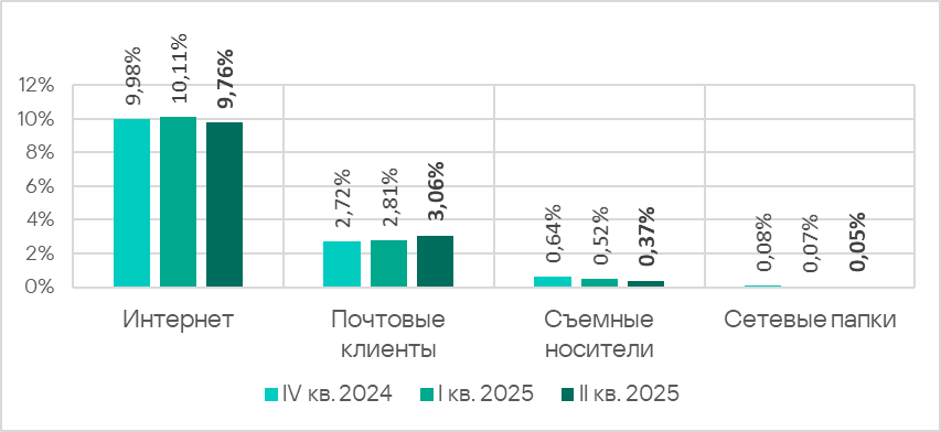 Во втором квартале 2025 года продолжила расти доля компьютеров АСУ, на которых были заблокированы угрозы, распространяемые через почту. Основные категории угроз из электронной почты, заблокированные на компьютерах АСУ, — это шпионское ПО, вредоносные скрипты и фишинговые страницы, а также вредоносные документы. Показатель вырос во всех регионах, кроме России. Показатели остальных источников угроз в среднем по миру уменьшились, более того — достигли минимальных значений со второго квартала 2022 года.