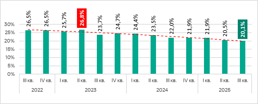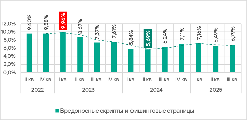 Доля компьютеров АСУ, на которых были заблокированы вредоносные скрипты и фишинговые страницы, III квартал 2022 года — III квартал 2025 года