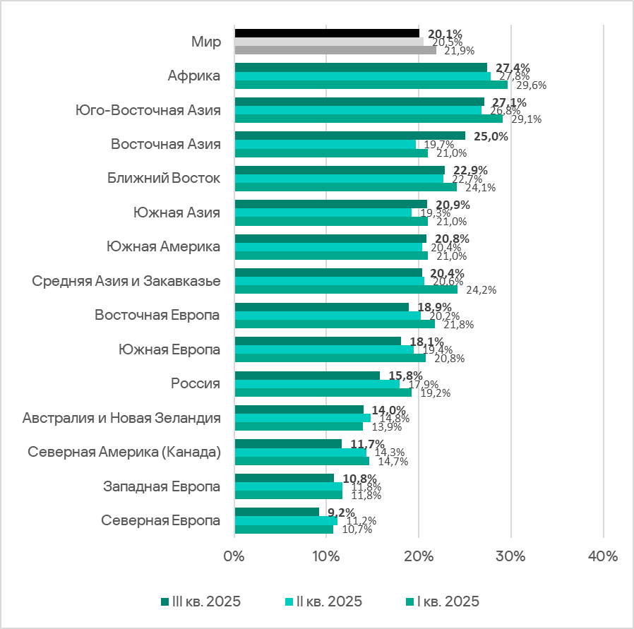В регионах доля компьютеров АСУ, на которых в третьем квартале 2025 года были заблокированы вредоносные объекты, варьируется от 9,2% в Северной Европе до 27,4% в Африке.