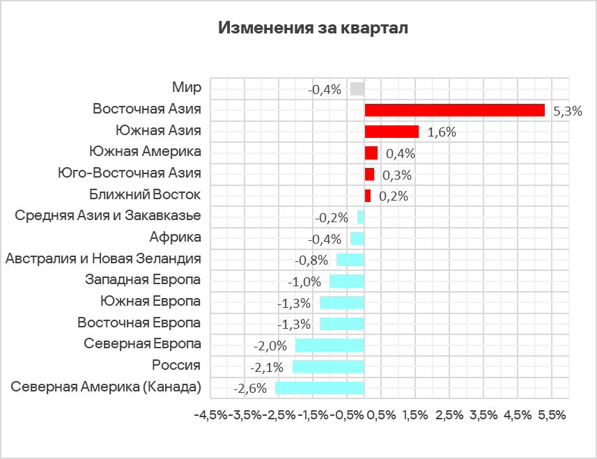 Больше всего показатель увеличился в Восточной Азии (на драматичные 5,23 п. п.). Это связано с локальным распространением вредоносных скриптов-шпионов, загружаемых в память популярных торрент-клиентов, в частности MediaGet.