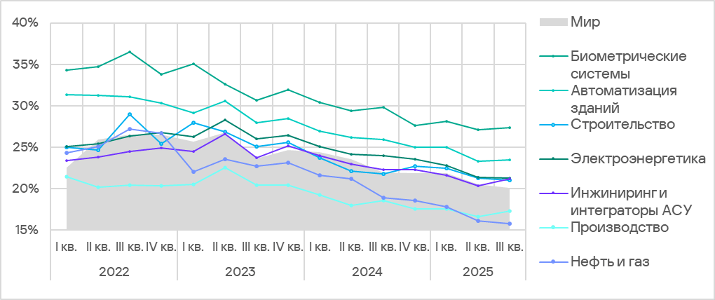 В третьем квартале 2025 года доля компьютеров АСУ, на которых были заблокированы вредоносные объекты, по сравнению с предыдущим кварталом уменьшилась на 0,4 п. п. и составила 20,1%. Это минимальный показатель за исследуемый период.