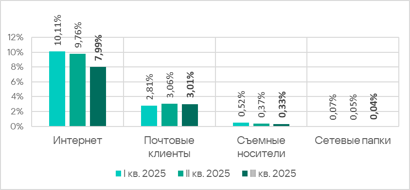 В третьем квартале 2025 года показатели всех источников угроз в среднем по миру уменьшились.