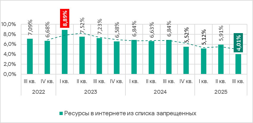 В третьем квартале 2025 года доля компьютеров АСУ, на которых были заблокированы ресурсы в интернете из списка запрещенных, уменьшилась до 4,01%. Это наименьший квартальный показатель с начала 2022 года.