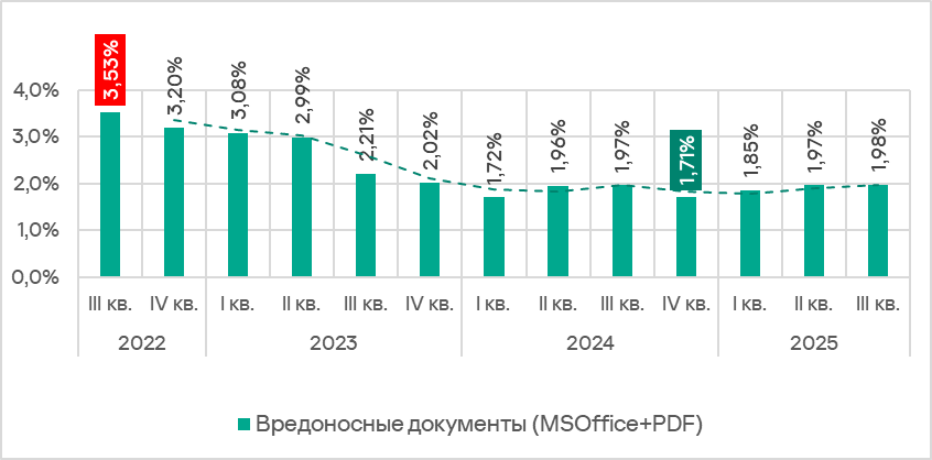 Доля компьютеров АСУ, на которых были обнаружены вредоносные документы, после снижения в конце 2024 года растет третий квартал подряд. В третьем квартале 2025 года показатель составил 1,98%.