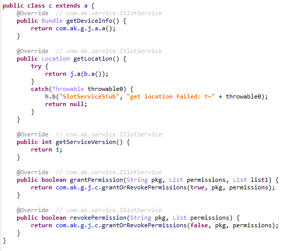 AKServer в начале своей работы рассылает два защищенных широковещательных сообщения (protected broadcast): com.action.SystemOptimizeService и com.action.SystemProtectService. Первое сообщение, как мы уже описывали, передает другим процессам, зараженным AKClient, экземпляр интерфейса для взаимодействия с AKServer. Вместе с сообщением com.action.SystemProtectService также передается экземпляр другого интерфейса для взаимодействия с AKServer. С помощью этого интерфейса вредоносные модули, скачиваемые в контекстах других приложений, могут: