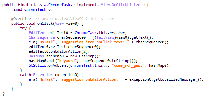 Модуль (MD5: 912bc4f756f18049b241934f62bfb06c) нацелен на браузер Google Chrome (com.android.chrome). В самом начале своей работы он регистрирует обработчик событий жизненного цикла активностей приложения (Activity Lifecycle Callbacks). При запуске каждой активности в целевом приложении этот обработчик проверяет ее имя. Если оно совпадает с ChromeTabbedActivity, троянец ищет поле для ввода текста (поисковых запросов и адресов веб-сайтов) под названием url_bar.