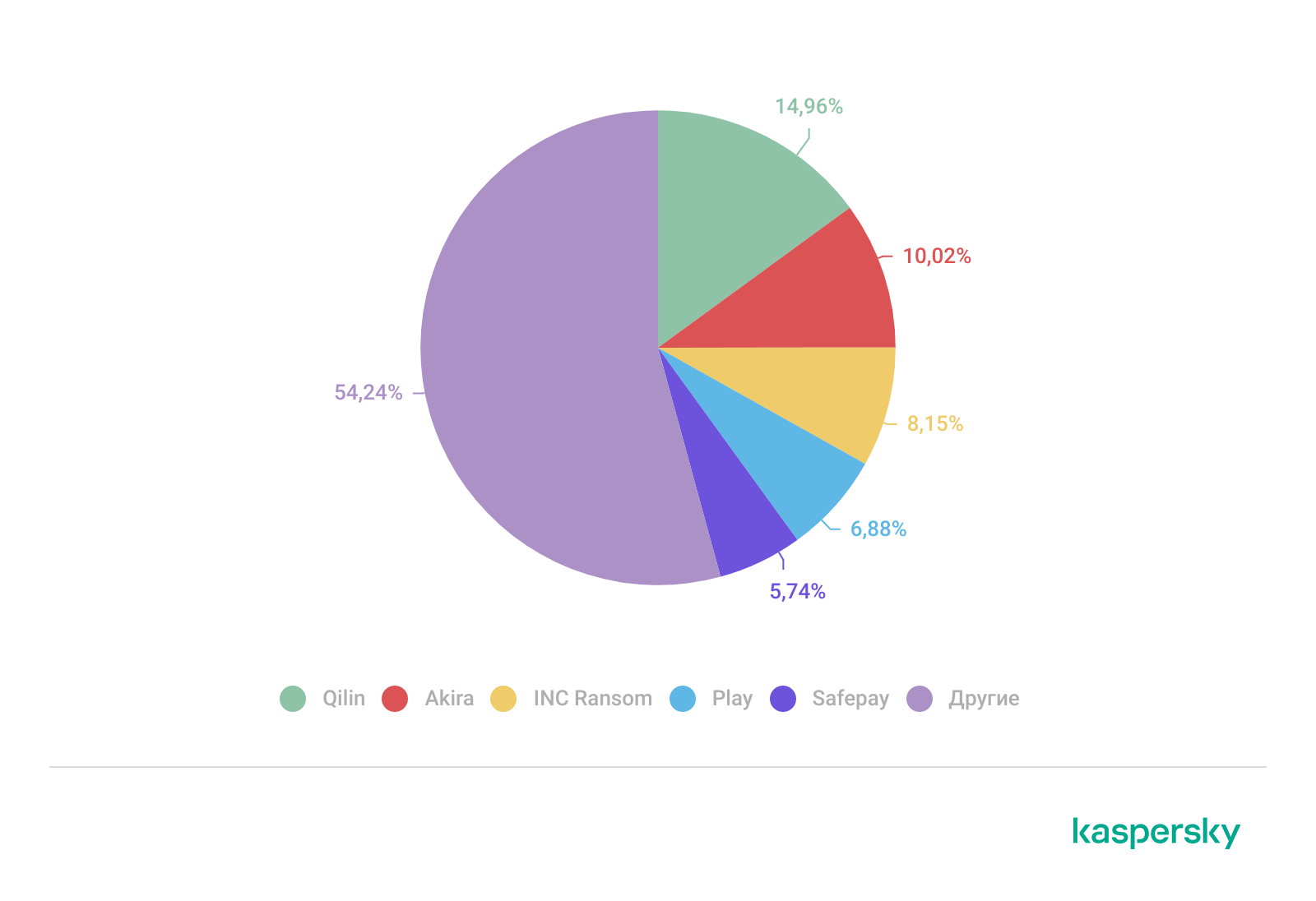 В этом разделе приводятся данные о наиболее активных вымогательских группах с точки зрения количества жертв, добавленных на их DLS. Как и в прошлом квартале, самой «продуктивной» была группа Qilin, чья доля выросла на 1,89 п. п. и составила 14,96%. Шифровальщик Clop снизил свою активность, а доля Akira (10,02%) незначительно выросла. На третье место поднялась группа INC Ransom (8,15%), действующая с 2023 года.