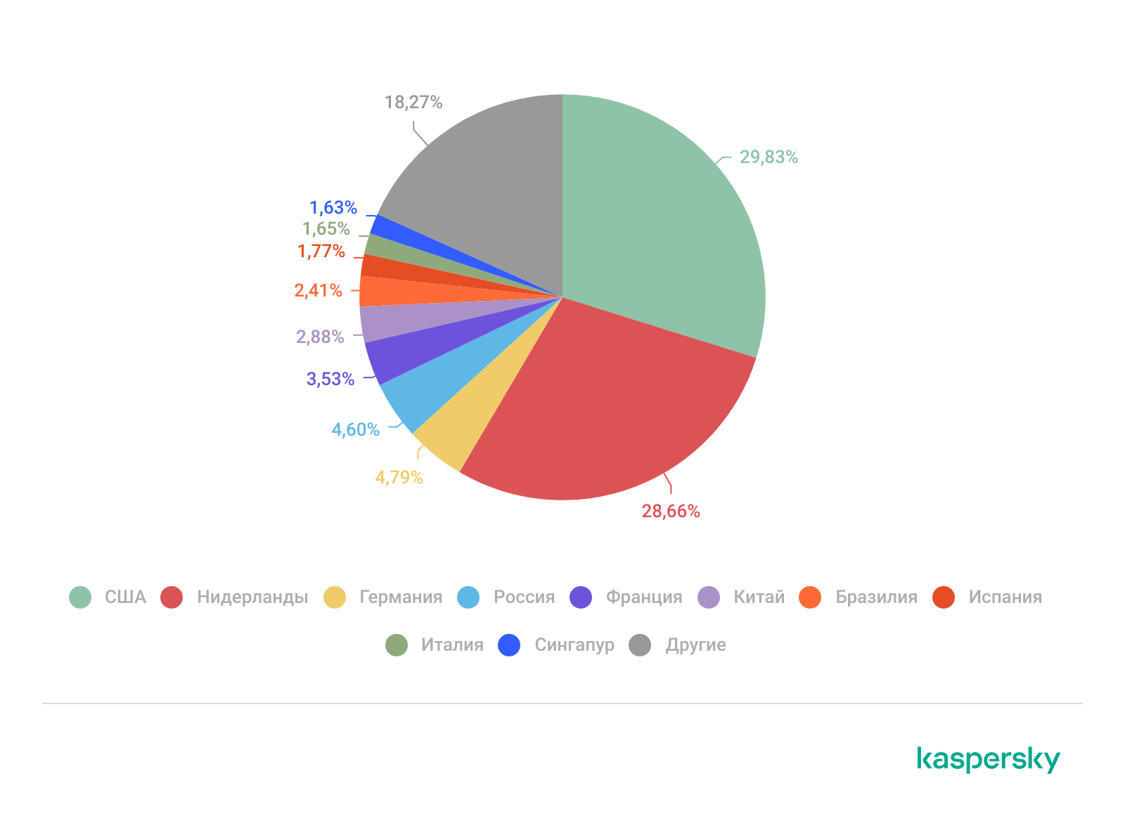 Данная статистика показывает распределение заблокированных продуктами «Лаборатории Касперского» интернет-атак (веб-страницы с перенаправлением на эксплойты, сайты с эксплойтами и другими вредоносными программами, центры управления ботнетами и т. д.) по географическим источникам. Отметим, что каждый уникальный хост мог быть источником одной и более веб-атак.