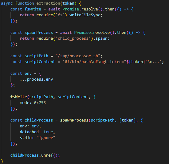 После прохождения проверок зловред получает информацию о текущем пользователе GitHub через вышеуказанный токен и запускает функцию extraction. Она создает временный исполняемый bash-скрипт по пути /tmp/processor.sh, а затем запускает его как отдельный процесс, передавая токен в качестве аргумента. Далее представлена функция extraction, в которой мы видоизменили строки и переименовали переменные для удобства чтения: исходный код был отформатирован в нечитаемом виде.