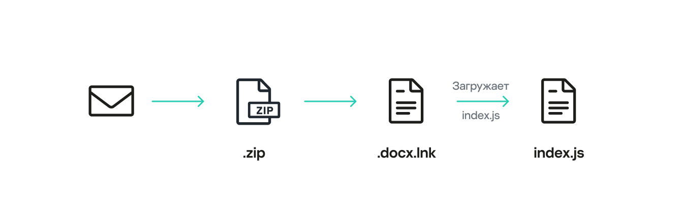 Атакующие отправляют электронное письмо с вредоносным вложением (архив, содержащий XLL-, MSI- или LNK-файл). Пользователь открывает содержимое архива, в результате чего инициируется загрузка и выполнение JS-скрипта.