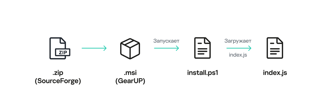 Внутри архива находится MSI-установщик GearUP-2.54.1-win.msi (MD5: 5573e0837078b432016637298d1ce926). Он выполняет скрипт install.ps1, содержащийся внутри пакета: