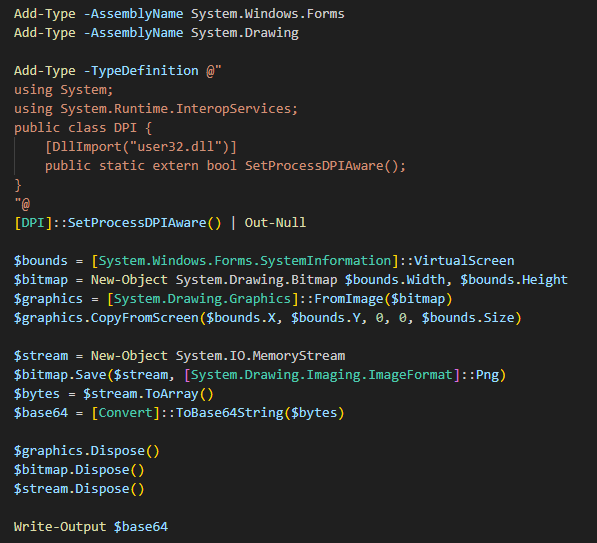 screenshot— сделать скриншот. Реализуется с помощью выполнения закодированного PowerShell-кода