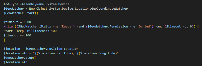 get-location— определить местоположение устройства. Реализуется с помощью выполнения закодированного PowerShell-кода