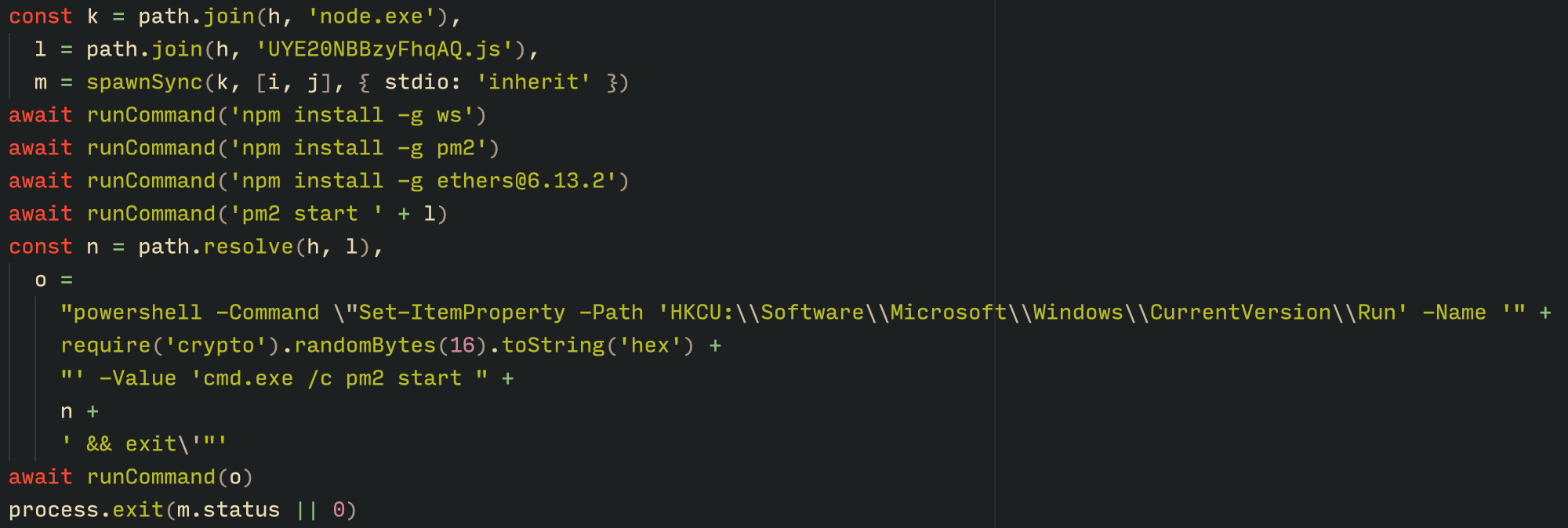 Разновидность модуля заражения в виде PowerShell‑скрипта более компактная и простая. Вместо конфигурационного файла и распаковщика, как в MSI‑установщике, он скачивает ZIP-файл node-v18.17.0-win-x64.zip с официального сайта Node.js (nodejs[.]org) и распаковывает его в каталог AppData\Local\NodeJS, по сути разворачивая среду Node.js на целевом устройстве. Далее модуль заражения расшифровывает две длинных шестнадцатеричных переменных с помощью алгоритма AES‑256‑CBC — в них содержатся скрипты бота и механизма закрепления. После расшифровки эти файлы вместе с package.json записываются на диск. Файл package.json содержит описание вредоносного пакета Node.js и необходимых зависимых библиотек, в том числе пакетов ws и ethers. В завершение модуль заражения выполняет оба скрипта: сначала скрипт закрепления, затем основной скрипт бота.