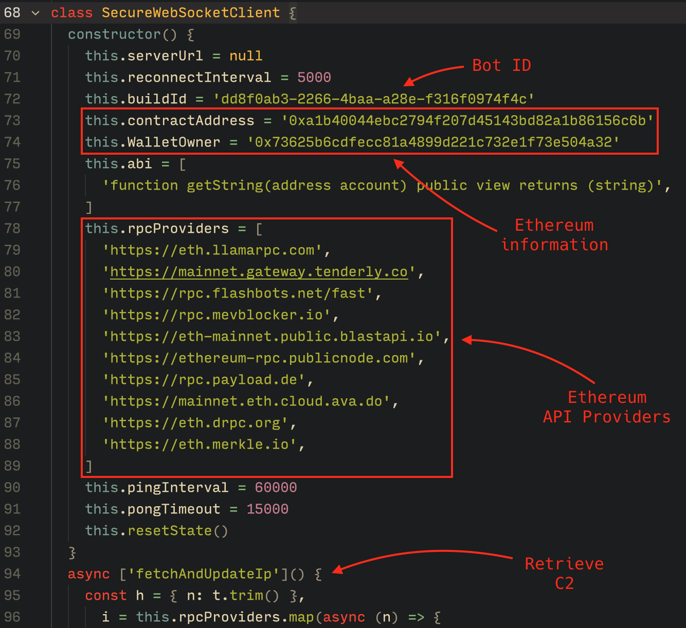 Чтобы получить адрес командного сервера, бот обращается к общедоступным конечным точкам, предоставляющим API удаленного вызова процедур (RPC) для взаимодействия с узлами блокчейна Ethereum. В начале скрипта бот вызывает функцию fetchAndUpdateIP, которая проверяет список поставщиков RPC-интерфейсов. Для каждого поставщика он анализирует транзакции, связанные с адресом контракта и владельцем кошелька, после чего получает строку из переменной состояния, содержащую адрес WebSocket, как уже было описано ранее.