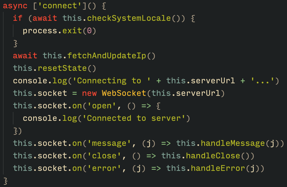 Бот Tsundere проверяет, что адрес командного сервера является корректным URL WebSocket и начинается с ws:// или wss://, после чего устанавливает полученную строку в качестве адреса сервера. Заполучив URL-адрес нового сервера, бот сначала анализирует региональные настройки устройства, чтобы избежать заражения систем в странах СНГ. Если устройство не относится к этому региону, бот пытается установить соединение с командным сервером через WebSocket и настраивает необходимые обработчики событий для получения и отправки данных, а также для контроля состояния соединения, включая обработку ошибок и закрытие сокета.