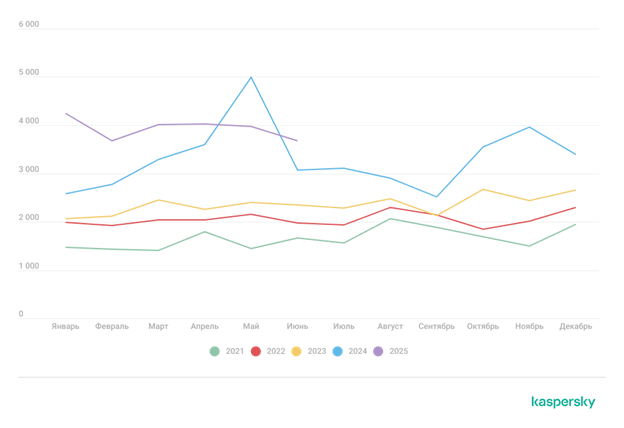 Этот график показывает общий объем уязвимостей, которые проходят процедуру публикации. Наглядно видно, что количество регистрируемых уязвимостей растет год от года, причем как совокупное, так и за каждый отдельный месяц. Например, на начало 2024-го было зарегистрировано порядка 2600 уязвимостей, а в январе 2025-го это количество уже превышало 4000, причем тенденция к росту числа опубликованных уязвимостей наблюдается каждый месяц, за исключением майских показателей 2025 года. Однако стоит учитывать, что в реестр попадают не только уязвимости с идентификатором текущего года. Так, публикация уязвимости с идентификатором CVE-2024-N может произойти в 2025 году.