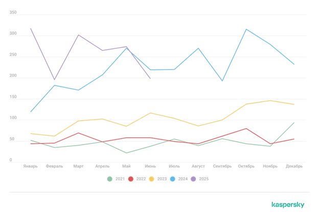 На графике ниже показана частота известных случаев использования С2-фреймворков в атаках на пользователей за первую половину 2025 года, согласно открытым источникам.