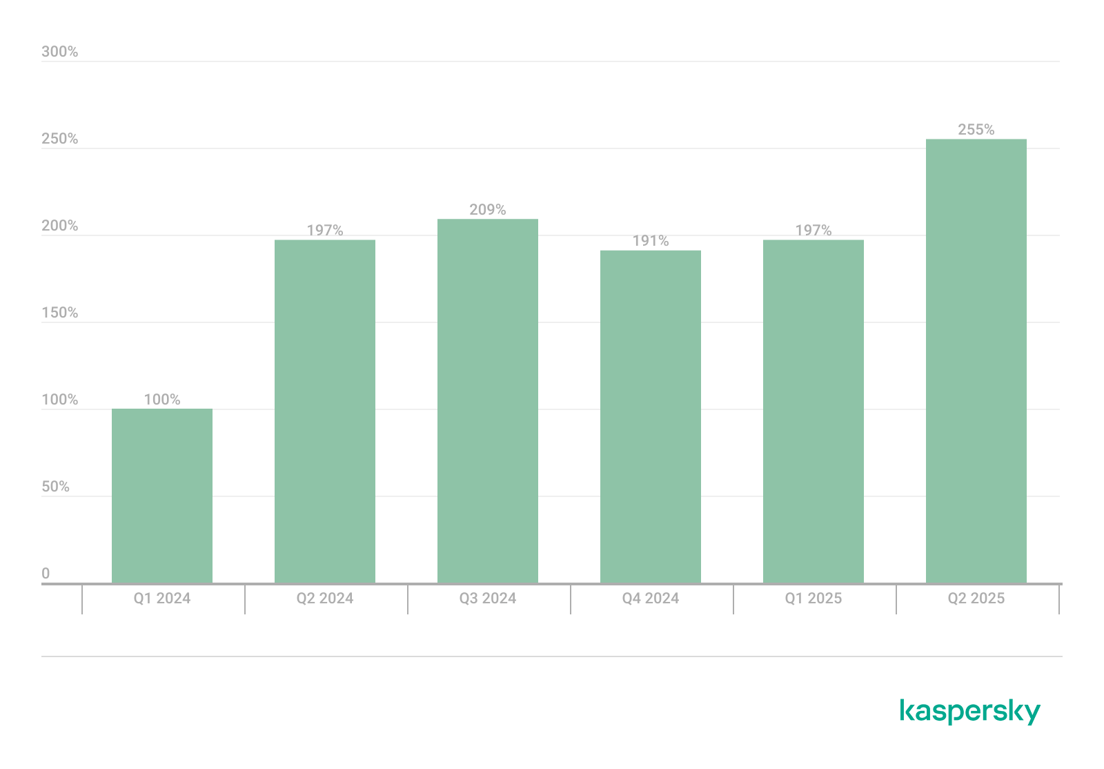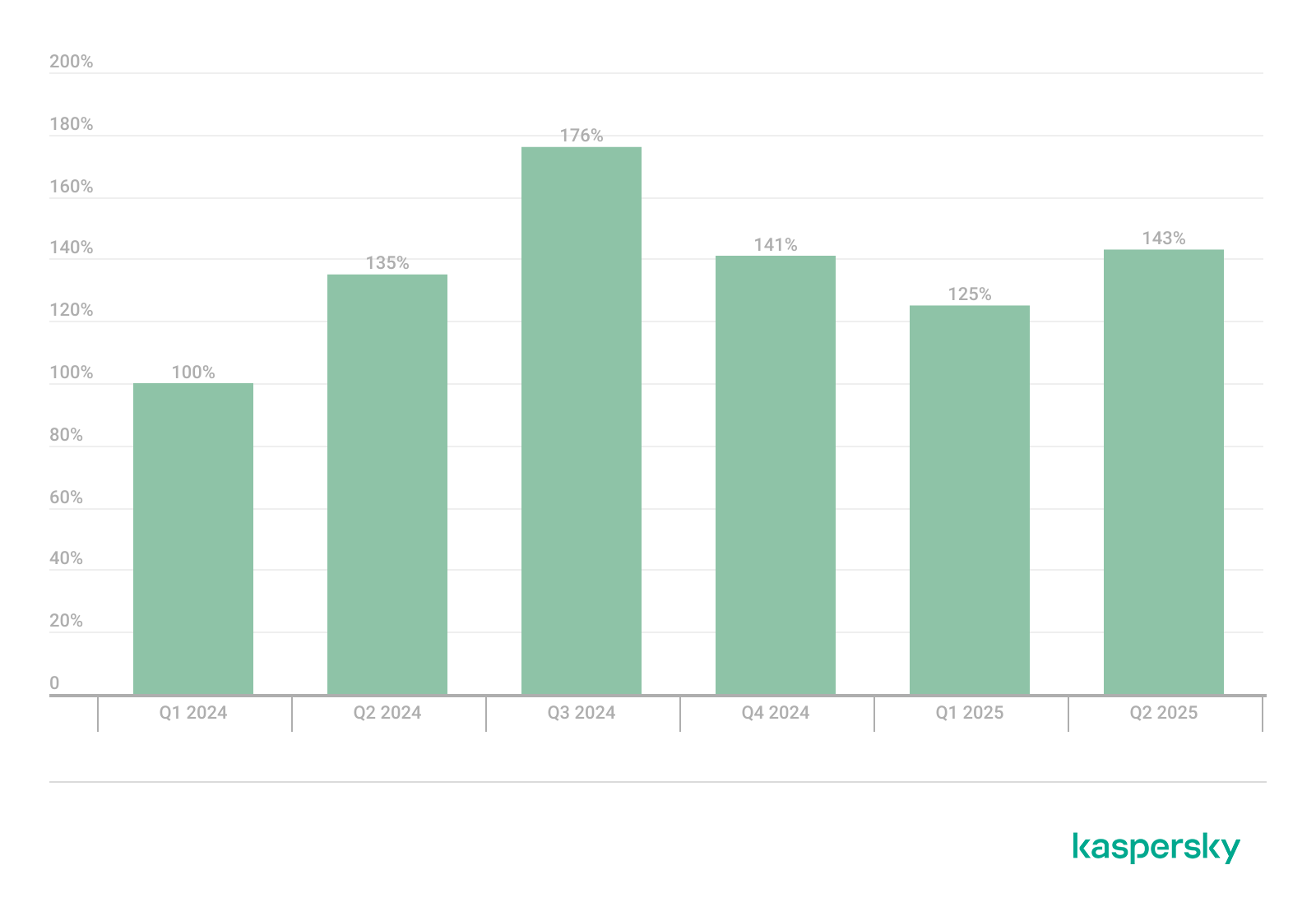 Динамика числа пользователей Windows, столкнувшихся с эксплойтами, Q1 2024 — Q2 2025. За 100% принято число пользователей, столкнувшихся с эксплойтами в Q1 2024 (скачать)