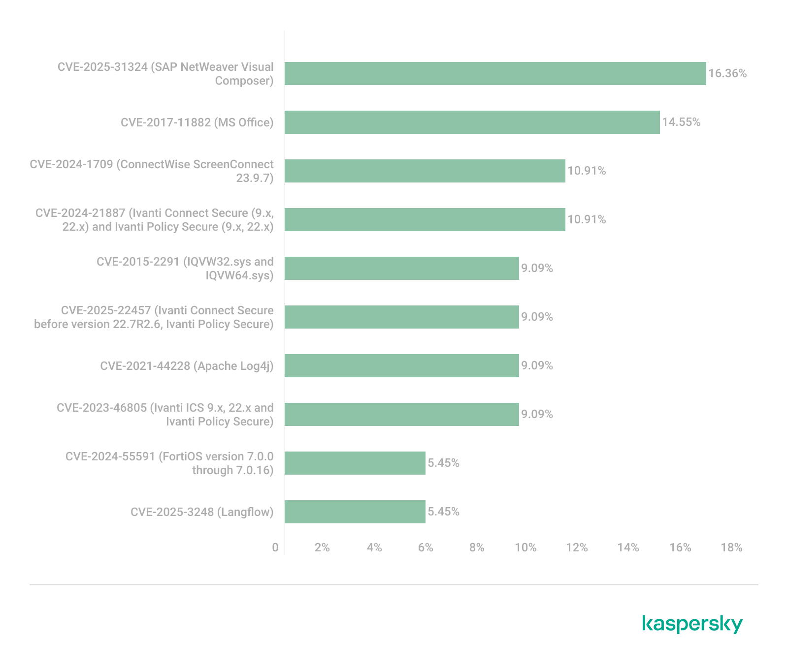 Мы проанализировали данные об уязвимостях, которые использовались в атаках APT-групп во втором квартале 2025 года. Представленный ниже рейтинг включает данные на основе нашей телеметрии, исследований и открытых источников.