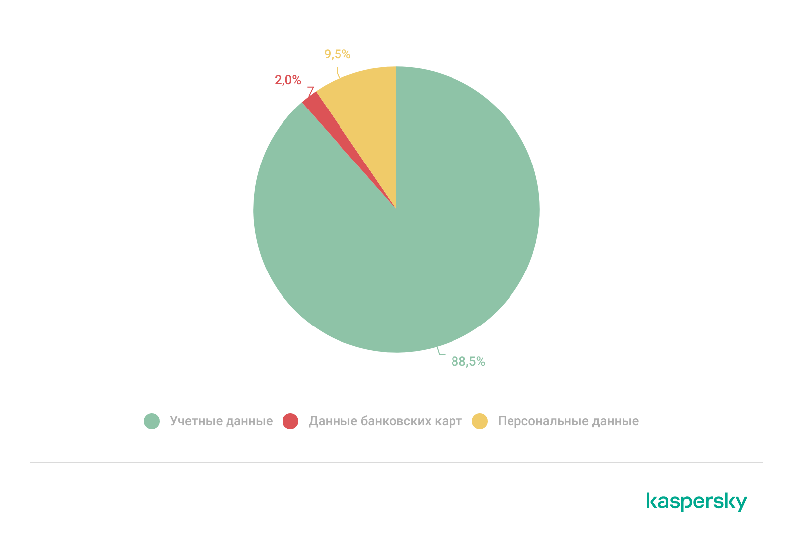 Мы проанализировали атаки с использованием фишинга и скама, проведенные с января по сентябрь 2025 года, чтобы определить, какие данные интересовали злоумышленников чаще всего. 88,5% атак были нацелены на кражу аккаунтов от различных онлайн-сервисов, на втором месте (9,5%) оказались персональные данные пользователей, такие как имя, адрес и дата рождения, а 2% атак целились на данные банковских карт.