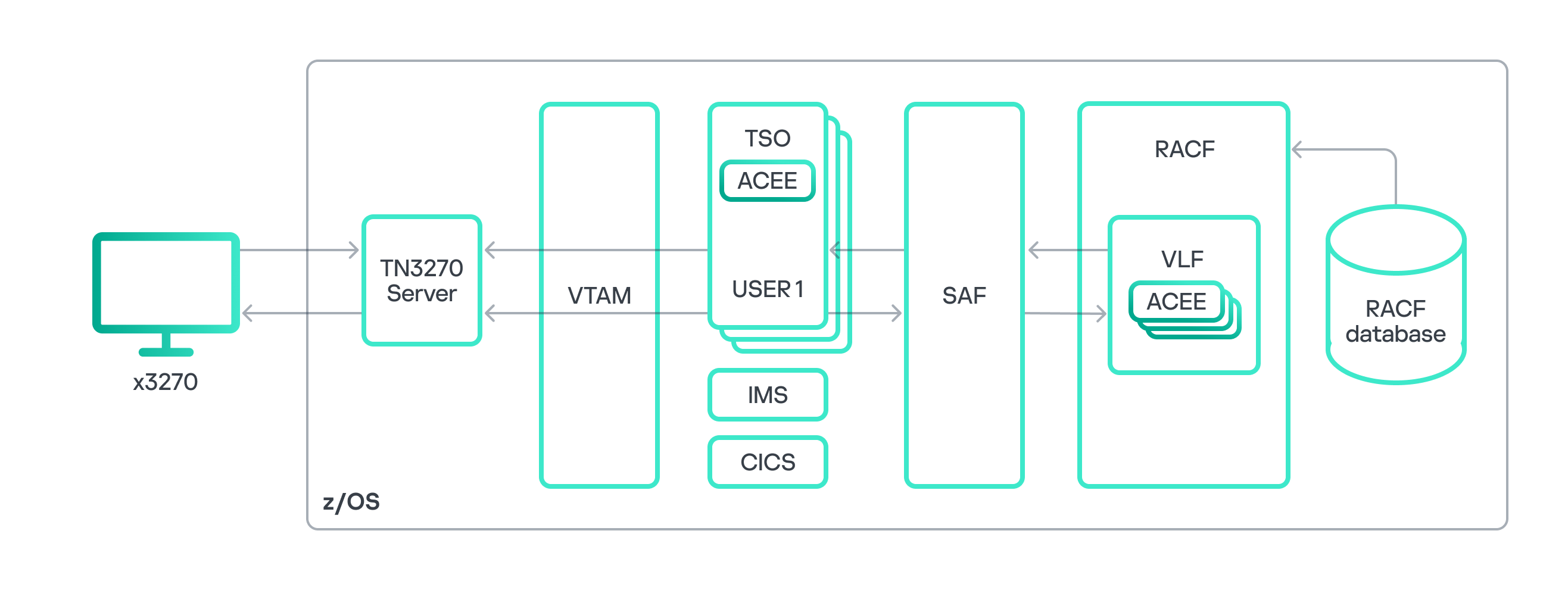 Операционная система z/OS использует в качестве пакета безопасности решение Resource Access Control Facility (RACF). Хотя z/OS поддерживает работу и с другими пакетами безопасности, в частности ACF2 и Top Secret, это стороннее ПО, которое нужно устанавливать отдельно. В RACF существуют два метода аутентификации на базе пароля: PASSWORD и PASSPHRASE. Кроме того, z/OS позволяет использовать оба одновременно, потому что некоторые приложения или сервисы могут аутентифицировать пользователя только методом PASSWORD.